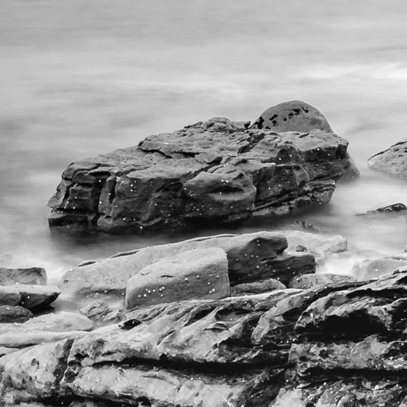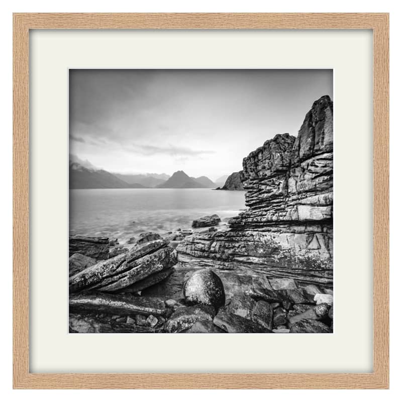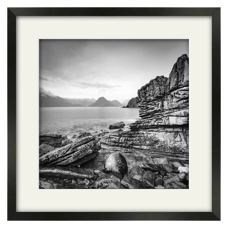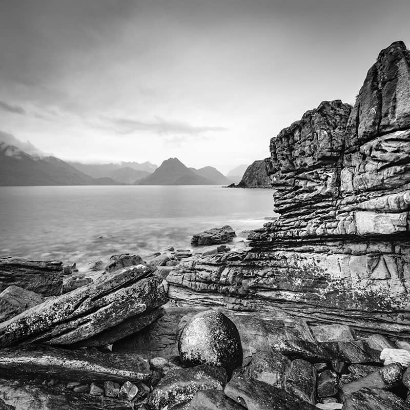 If you have been to the Isle of Skye and have yet to make the long winding drive down to Elgol then I highly recommend it. The drive itself is worth the 30 minute or so journey with stunnng scenes round every bend. At Elgol the views looking over Loch Scavaig towards the Black Cuillins are truly breathtaking, whatever the weather. The sunsets from this location are something else too. I am yet to be at Elgol for sunset be I still like the composition and moody nature of the wet weather captured in this image. This image means a lot to me as my 10 year old daughter scrambled over the wet rocks to hold the umbrella over my camera equipment. A team effort. This image is available in colour and is also part of my Scottish Islands Portfolio, which contains many other Isle of Skye prints.