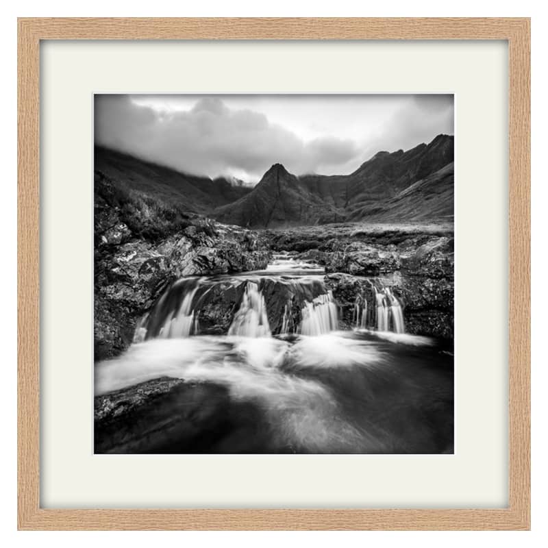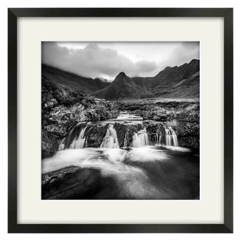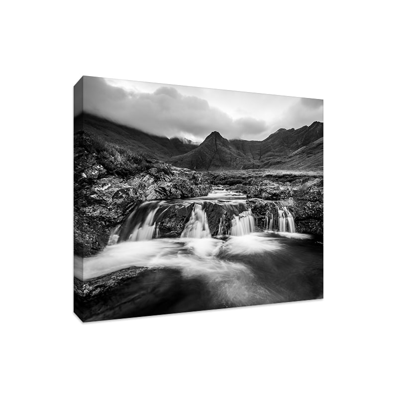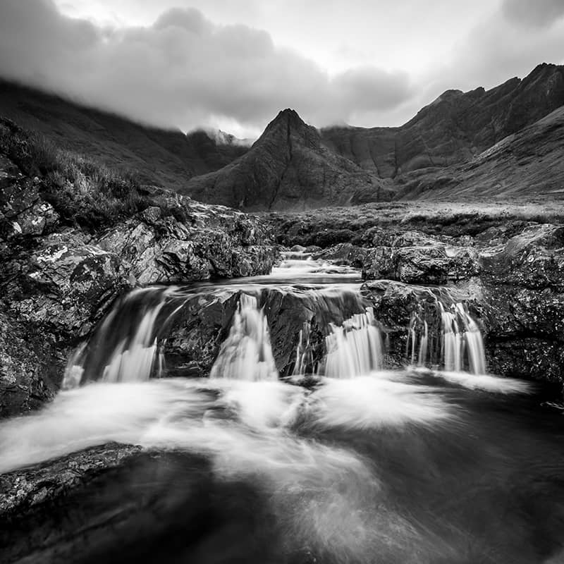 When I think of the Isle of Skye, this image really does sum the Island up for me. Dark, moody, rugged ever changing weather. This is an image from the Fairy Pools in Glenbrittle. I managed to get in the river with my wellies on to capture the low angle of the waterfalls looking up to the imposing Black Cuillins in the background. Far less brave than many visitors who flock here in their thousands to go wild swimming in the many crystal clear spring water pools. I was fortunate to get the pools to myself for a good hour. I did get there very early, just after sunrise in August. Wanting to take a nice picture here for a while I was glad to be there alone as I had to place myself precariously in the water. Needless to say I was very happy with the results I got and the weather was great. I also offer the colour version of this Fairy Pools image for sale.